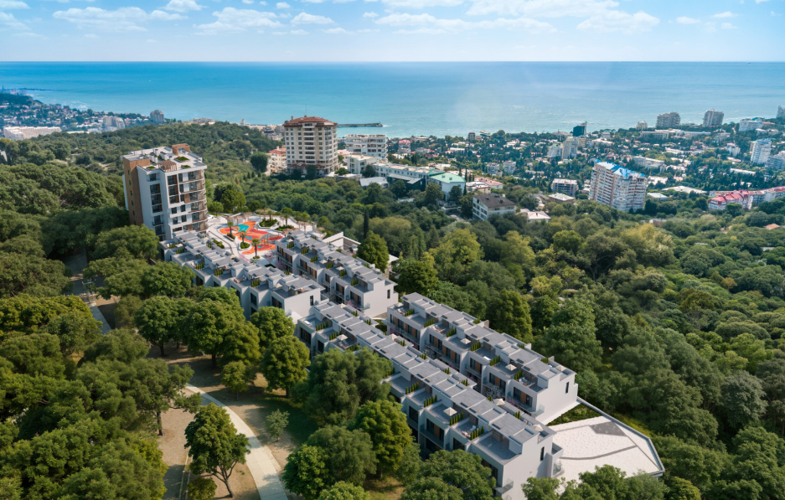 Несмотря на городскую локацию, квартал «Миндаль» скрыт от постороннего шума — это зелёное, камерное пространство с богатой крымской флорой.